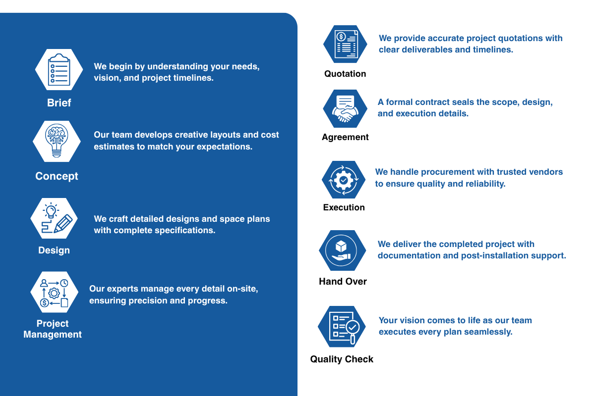 We provide end-to-end project management solutions, ensuring seamless execution, timely delivery, and superior quality for every interior and construction project.